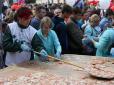 Із вже "традиційних скрепних частувань" жителям міста Томськ запропонували піцу на лопаті. У натовпі почалася справжня тиснява - кожен намагався дотягнутися до безкоштовних частувань.