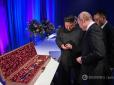 Диктатор Північної Кореї Кім Чен Ин подарував президенту РФ Володимиру Путіну меч, прикрашений коштовностями. Про це в Twitter розповів журналіст кремлівського пулу Дмитро Смирнов, повідомляють Патріоти України. "Кім Чен Ин подарував Путіну меч: Меч у...